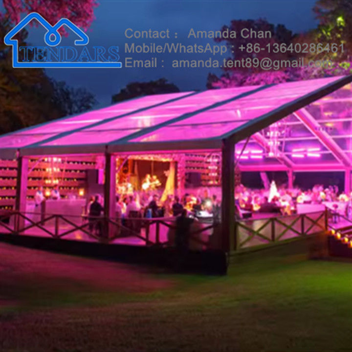 Ketahanan Cuaca: Kain PVC transparan dirancang untuk memberikan perlindungan terhadap unsur-unsur, termasuk hujan, angin, dan sinar matahari.mencegah air dari menyusup melalui atap dan menjaga tamu kering selama cuaca hujanSelain itu, kain ini tahan UV, membantu memblokir sinar UV yang berbahaya dan mengurangi penumpukan panas di dalam tenda.